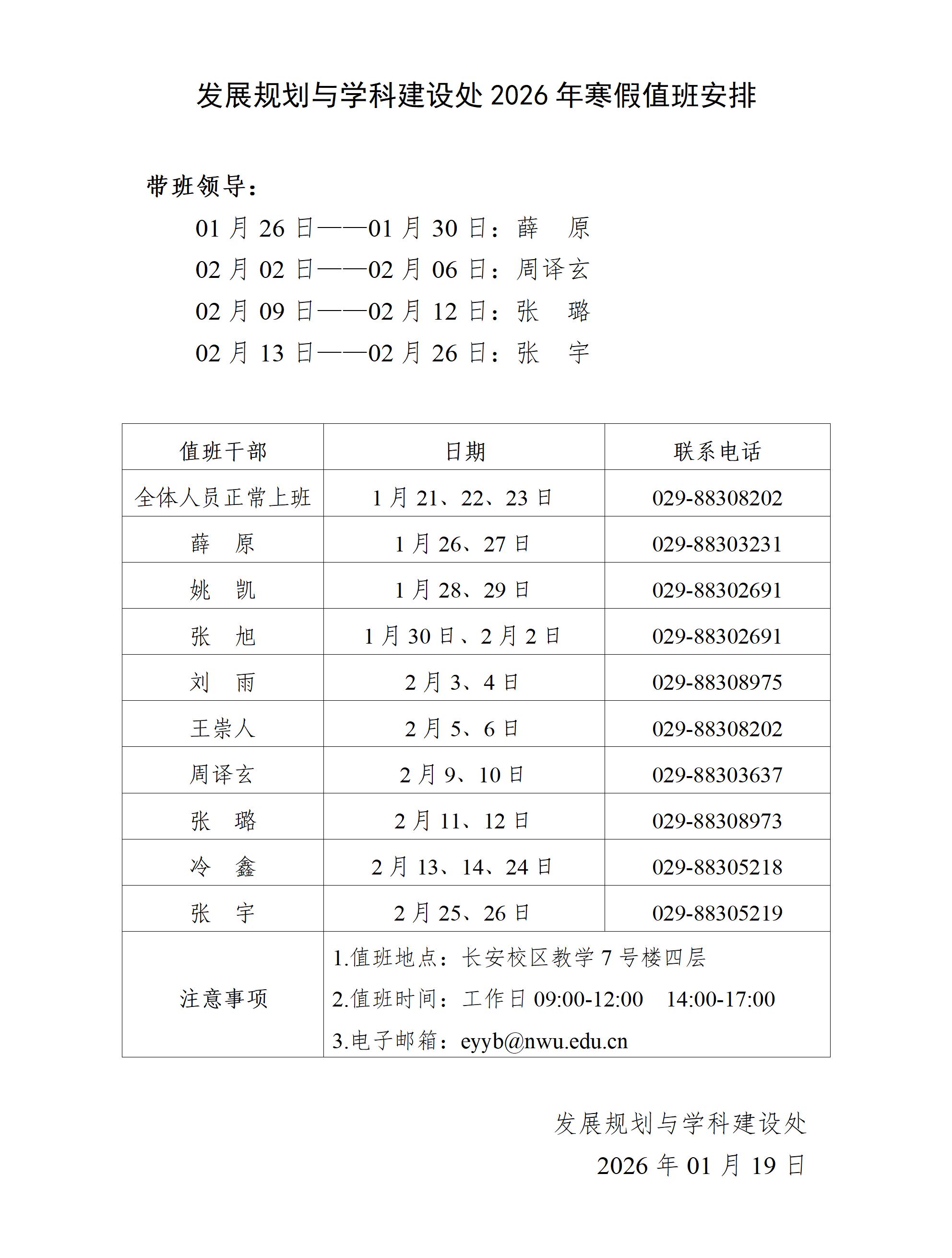 发展规划与学科建设处2026年寒假值班安排